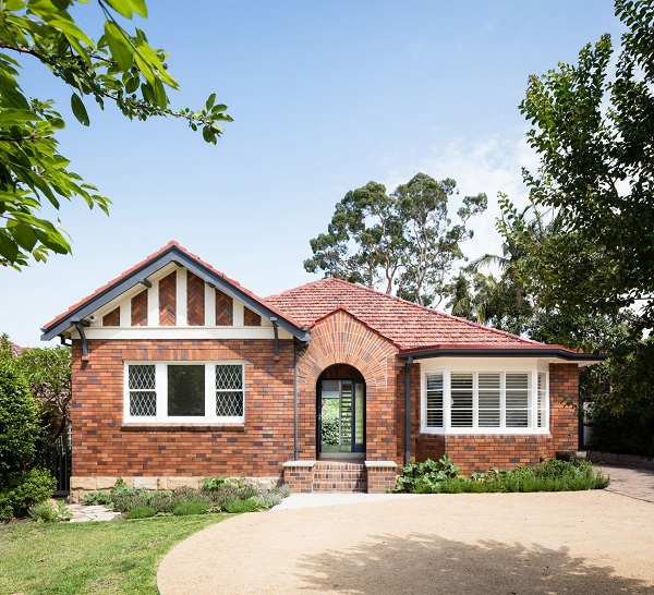 Phần nhà mở rộng này cho một ngôi nhà gỗ những năm 1930 ở ngoại ô Sydney có những bức tường kính, cửa sổ hình hộp nhô ra và những viên gạch trang trí theo phong cách cổ của tòa nhà.